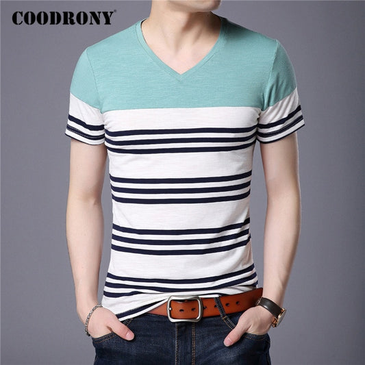 COODRONY Short Sleeve T Shirt Men Streetwear Fashion Striped Tops Casual V-Neck T-Shirt Man Summer Cotton Tee Shirt Homme C5086S