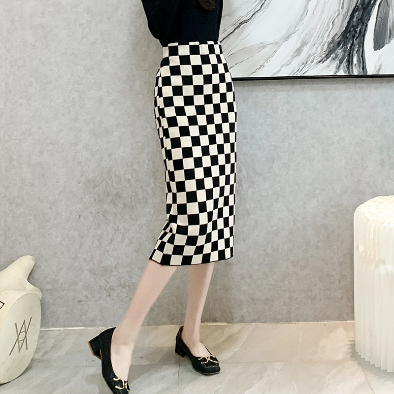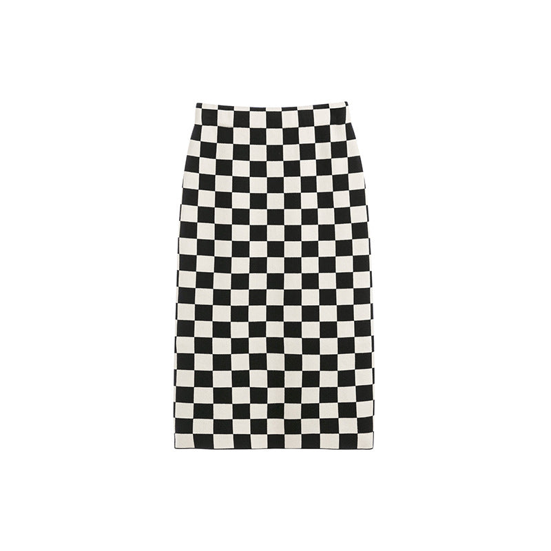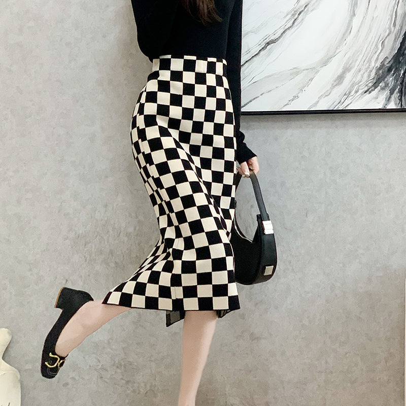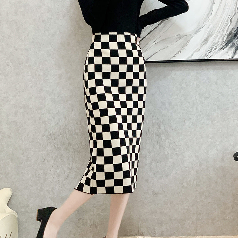 Chessboard Plaid Knitted Skirt Women's Autumn And Winter Korean Style